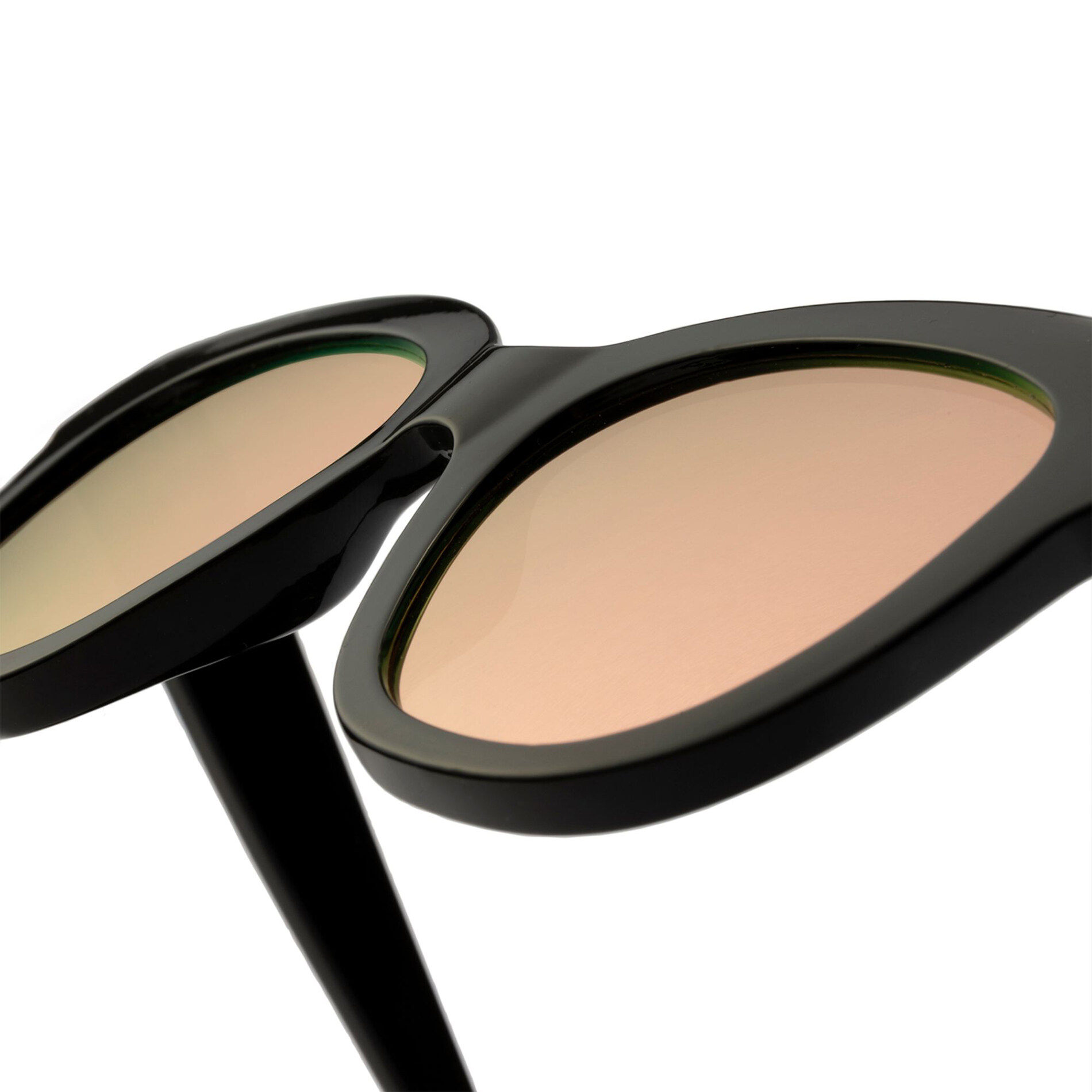 The elegant rounded butterfly design of these women’s sunglasses is reminiscent of the Hollywood of the 70s. The polished black frame and mirrored rose gold lenses impart a sophisticated, feminine look.