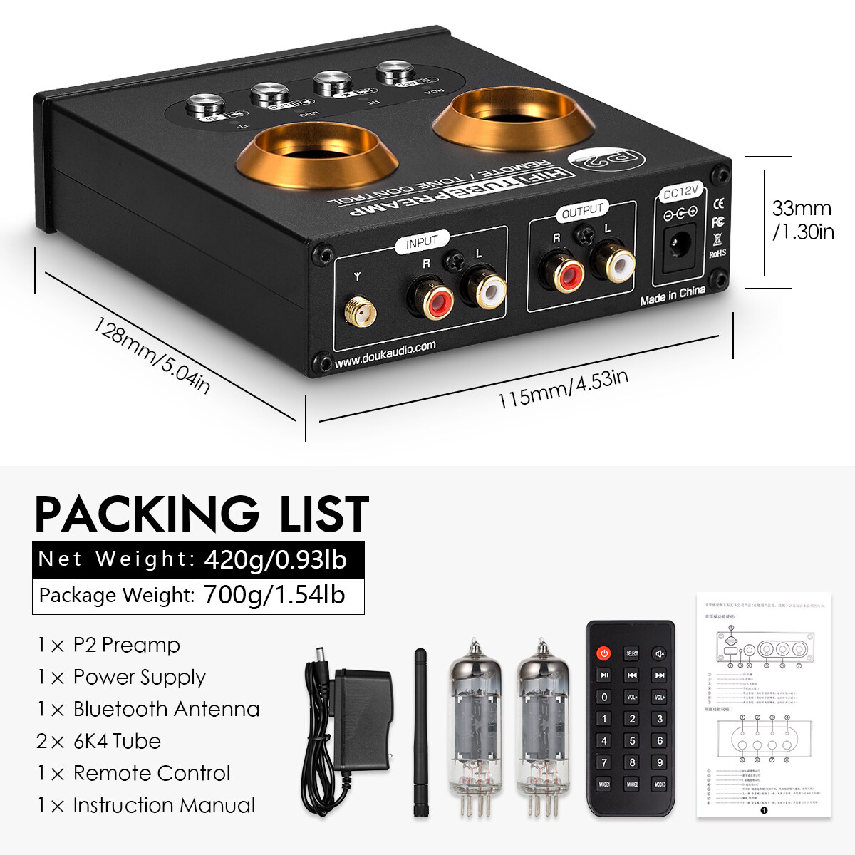 1. P2 is a tube preamp which needs to work with amplifiers or active speakers, cannot drive passive speakers or used with turntables directly. In RCA input mode, the previous / next song function is invalid.
