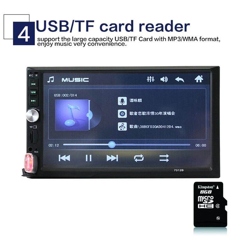 Features: Color: Black Model: 7012B 3rd Material: Plastic + Metal Screen type: TFT Screen size: 7 inch Resolution: 800x480 Power supply voltage: DC 12V Horn impedance: 4 ohms Maximum power: 50W x 4 Volume control: ±8 dB (bass 100HZ, treble 10KHZ) Function: Bluetooth, charger, MP3 players, radio tuner, touch screen, rear view 7'' HD TFT display screen With rear view function Support SD card, U disk play Any state of power failure memory function Built-in Bluetooth function, can match the smart phone Built-in radio AM / FM tuner, automatic search platform function Supports playback of AVI / JPEG / WMA / MP3 / format programs EQ sound control, stereo, left channel, right channel selection/Andriod /IOS Mirror Link Package : 1 x 7012B 3rd Car Radio Player 1 x Remote Controller 1 x Cables Kit 1 x Manual Note: This machine is 12V machine, not according to the 24V power supply