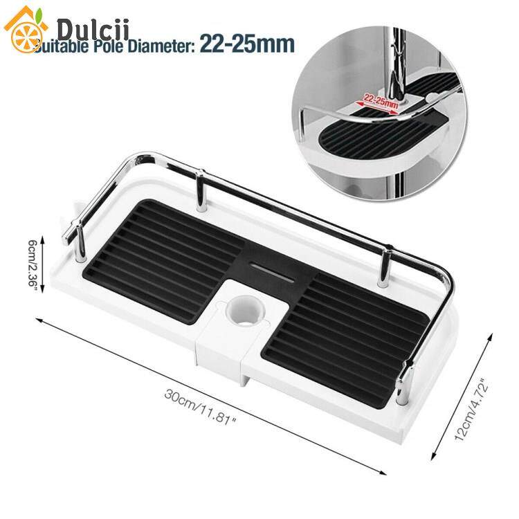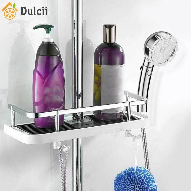 Dulcii Bathroom Pole Storage Shelf No Drilling Lifting Bar Shampoo Tray Shower Head Holder with Double Hooks Simple Bathroom Racks Shower Rack Bathroom Storage Basket