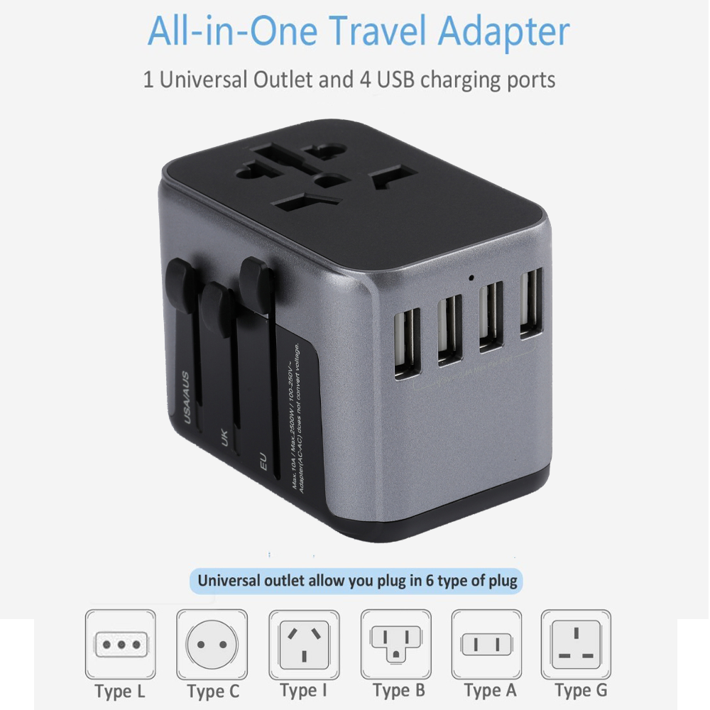• 5 in 1 Input Universal Outlet Adapter: International adapter plug converter with 4 USB outlet can detect charged devices and deliver optimum fast charging speed up to 2.4A (max) each port for cell phone, power bank etc.(It doesn’t support quick charge). Idea for use at home or hotel as a USB wall plug. Allow you charge up to 5 devices simultaneously