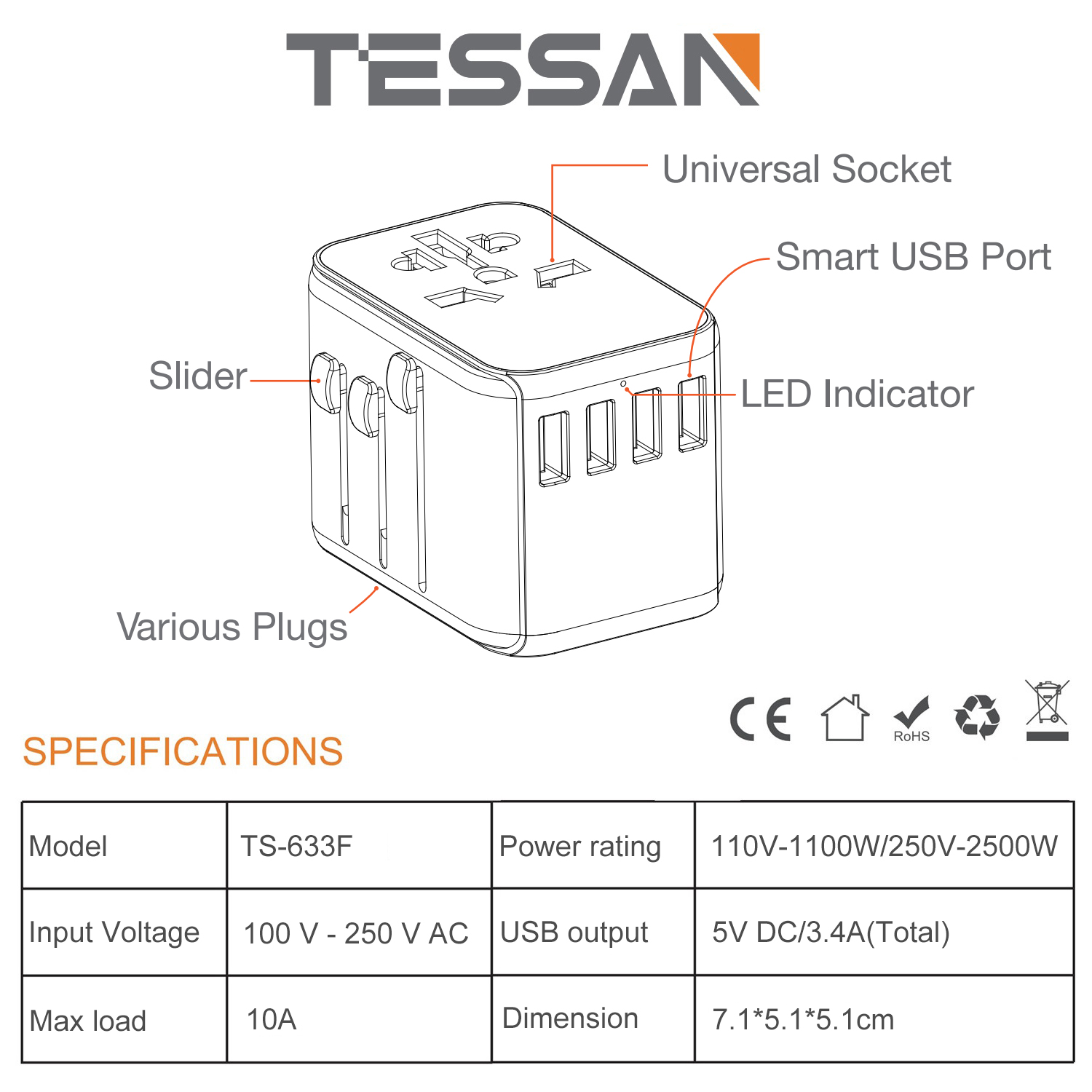 • Please Note: TESSAN Power adapter converts the power plug only, does not convert voltage; Some country like China, Philippines is 220V, your devices need to support dual voltage ( 100V to 250V)