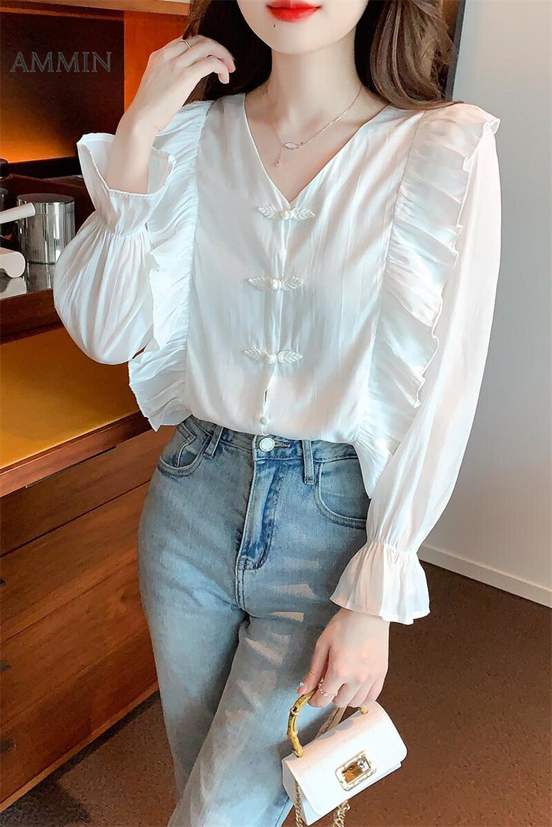 AMMIN 2022 Autumn new sweet chic high-grade white chiffon shirt Korean-style fashion temperament V-neck ruffle lantern sleeve chiffon top For women