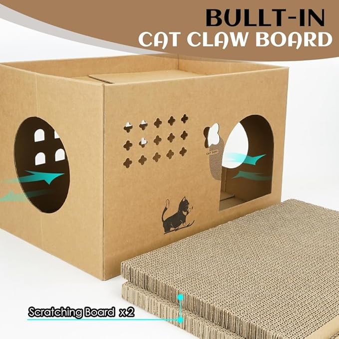 • 【 Exclusive Design】: Our cat scratcher features a unique cactus pattern, adding a touch of design to your cat's home. 2 in 1 cat getaway villa, this cat cardboard house is not only a cat playhouse for resting and napping, but also a cat scratcher board for exercising and playing.